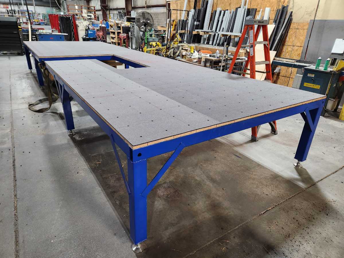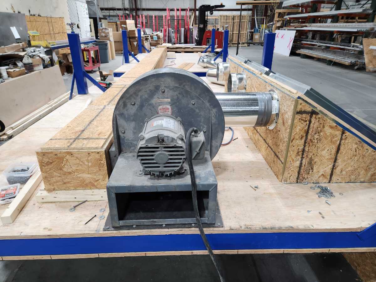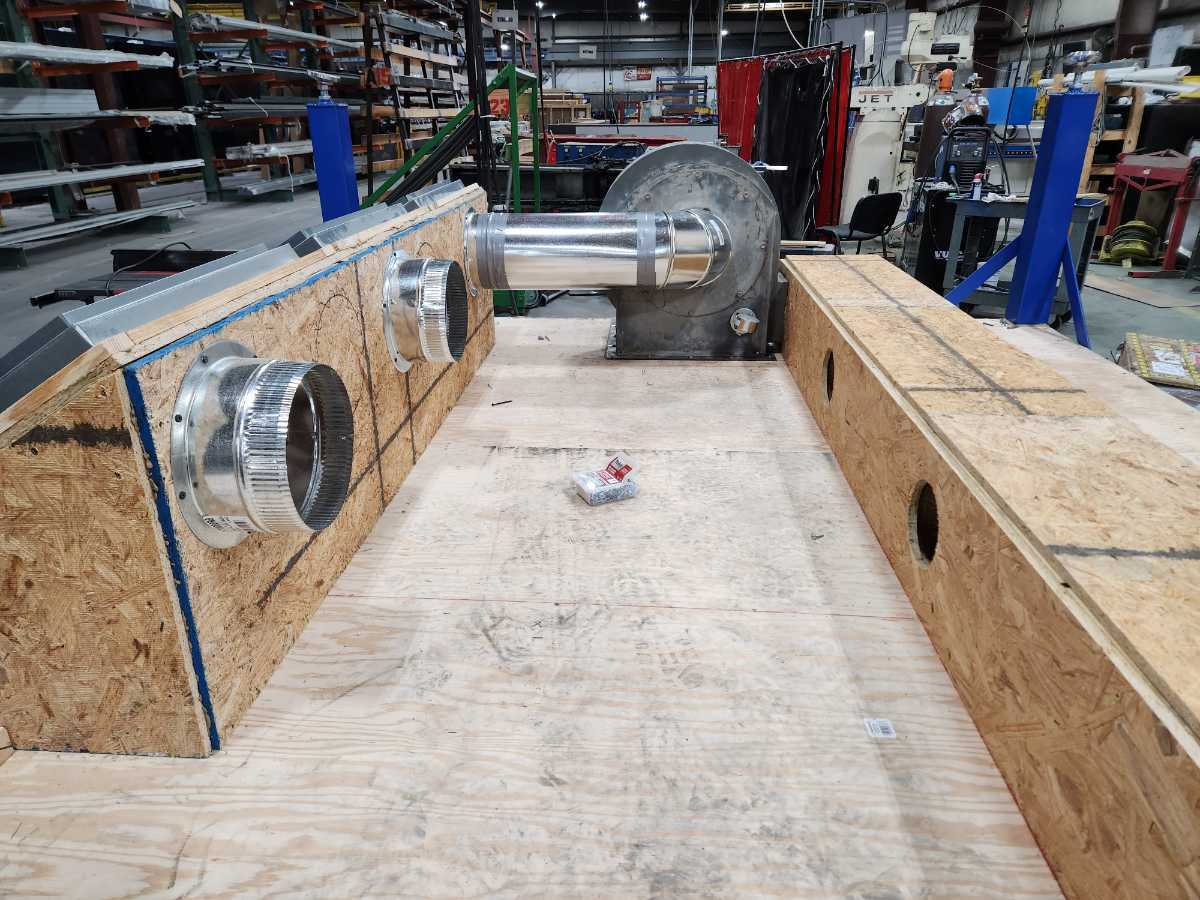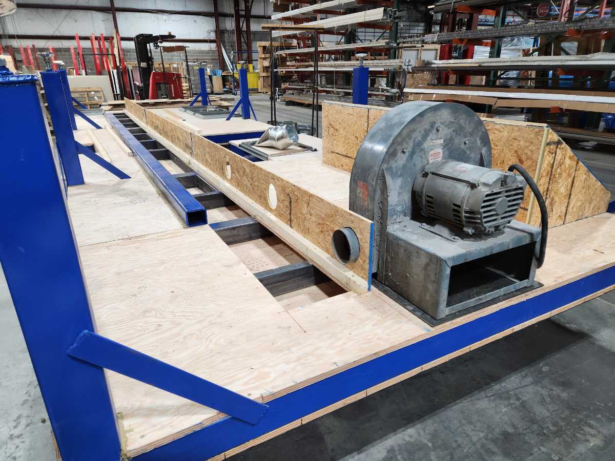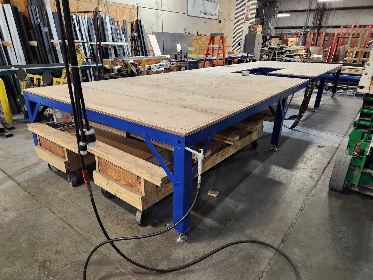 This is a seamer float table I designed for work. The blower motors are attached to the bottom side of the table along with the air filters to prevent clutter under the table. With it designed this way there is nothing on the ground allowing for easy cleanup with a broom or an air gun.